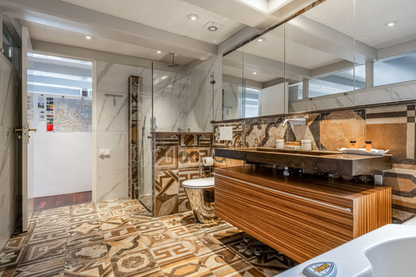 SECOND (modern) BATHROOM: gorgeous view over District Lake – with shower, toilet bowl, urinal and two wash basins.